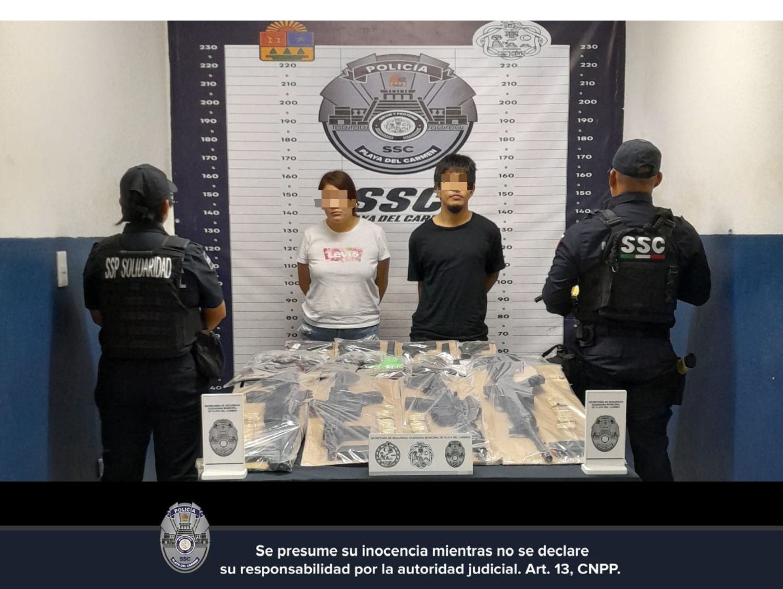 Durante recorridos de vigilancia en la colonia Ejido, elementos de la Secretaría de Seguridad Ciudadana de Playa del Carmen detuvieron a un hombre y una mujer que llevaban consigo varias dosis de lo que parece ser droga, además de un arsenal de ocho armas y municiones.